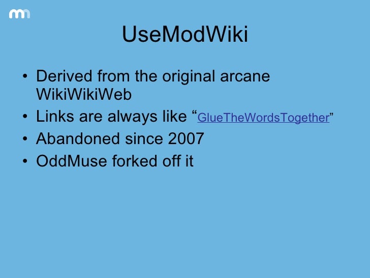 ResponderEliminarUseModWiki es probablemente el software más popular de wiki (en términos de número de wikis más que en el número total ediciones) a pesar del hecho de que tiene pocas características. Esto es debido al poco poder de procesamiento requerido (con respecto a otras implementaciones de wiki tales como TWiki o MediaWiki) y a su facilidad de la instalación.